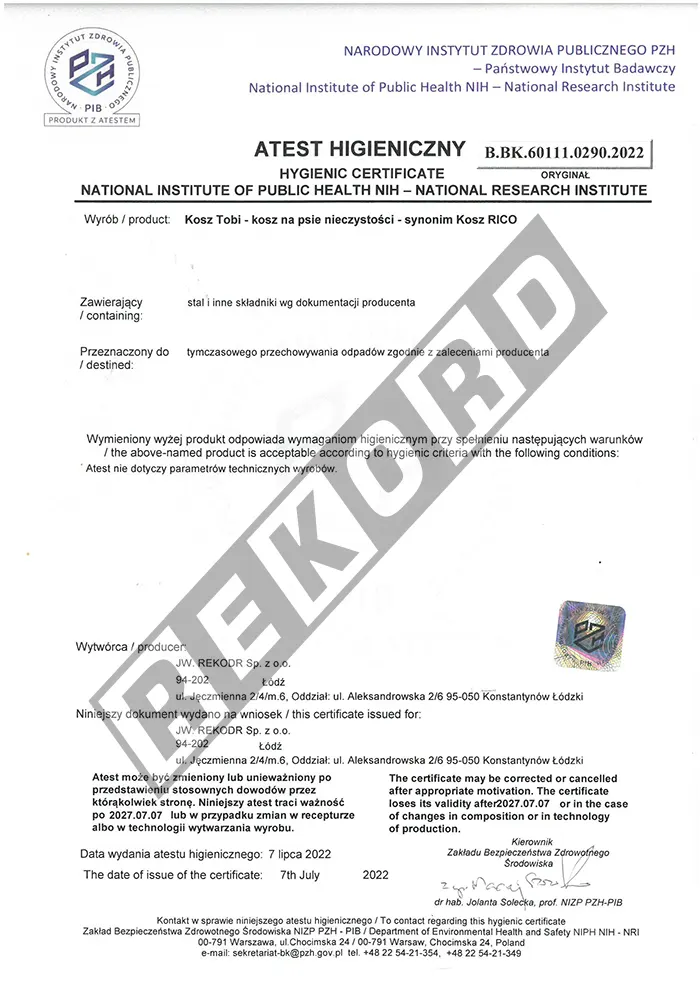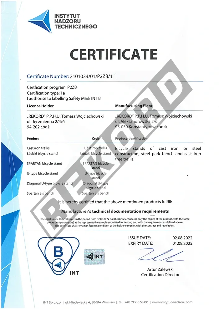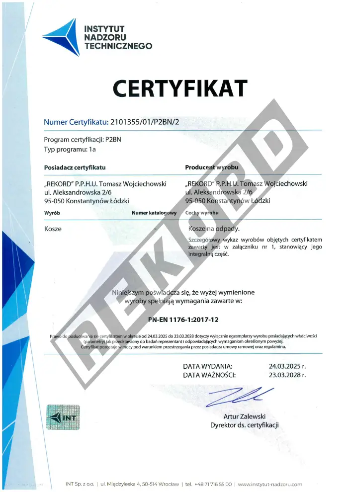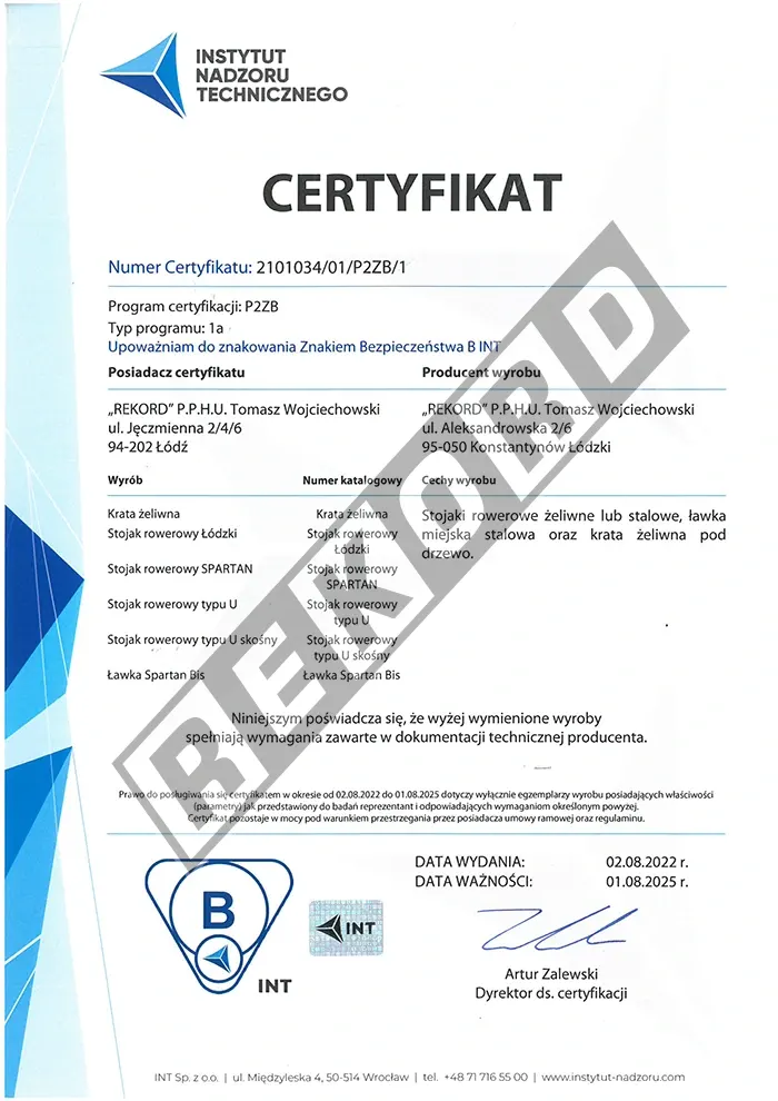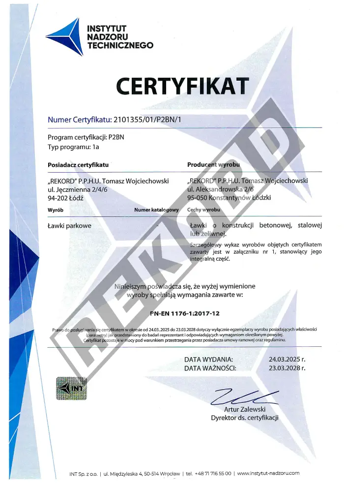 Wszystkie nasze produkty są trwałe i spełniają rygorystyczne normy jakościowe. Zaświadczają o tym certyfikaty zgodności, które uprawniają do oznaczania wyrobu znakiem bezpieczeństwa. Wiele z naszych produktów posiada certyfikat zgodności z europejską normą PN EN 1176, który gwarantuje, że zakupione ławki parkowe i kosze na śmieci są bezpieczne dla wszystkich użytkowników i przyjazne dla środowiska.