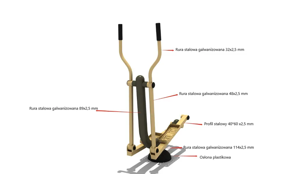Postaw obie nogi na podestach i złap rękami za oba uchwyty. Poruszaj nogami na przemian do przodu i do tyłu, jednocześnie pomagając sobie rękami na przemian ciagnąc i odpychając drążki.