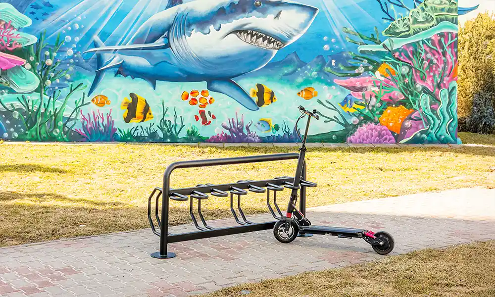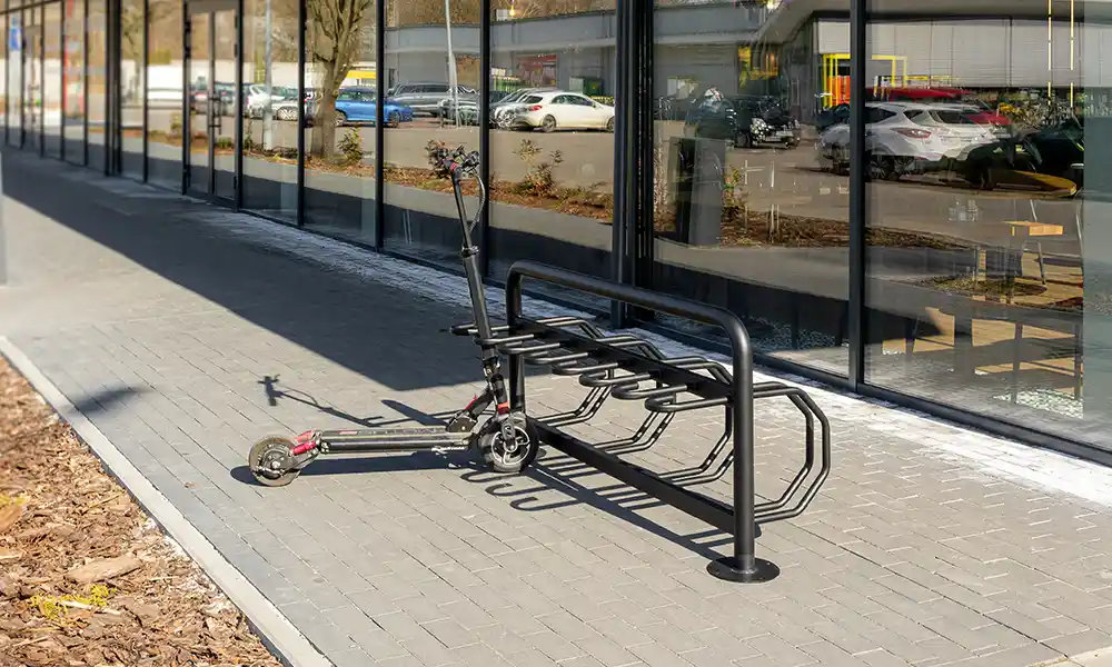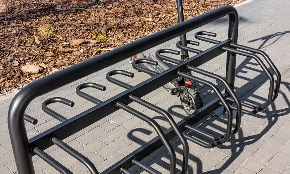 Przemyślany kształt elementów umożliwia stabilne ustawienie zarówno roweru, jak i hulajnogi, a jednocześnie pozwala na wygodne przypięcie zabezpieczenia. To rozwiązanie zwiększa bezpieczeństwo użytkowników i ogranicza ryzyko uszkodzenia sprzętu.