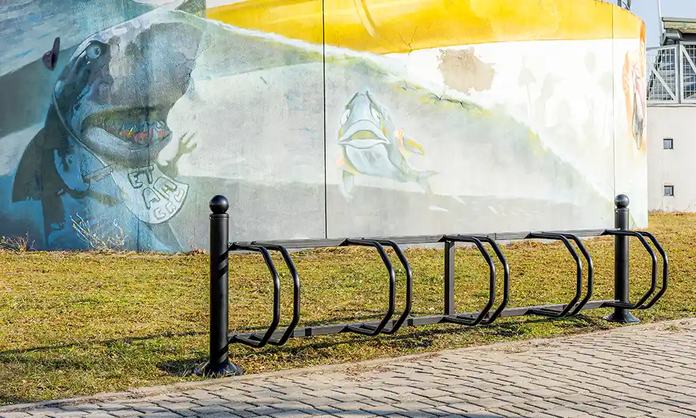 Stojak rowerowy Wilno – 5 stanowisk świetnie dopasuje się do każdego miejsca przestrzeni publicznej.